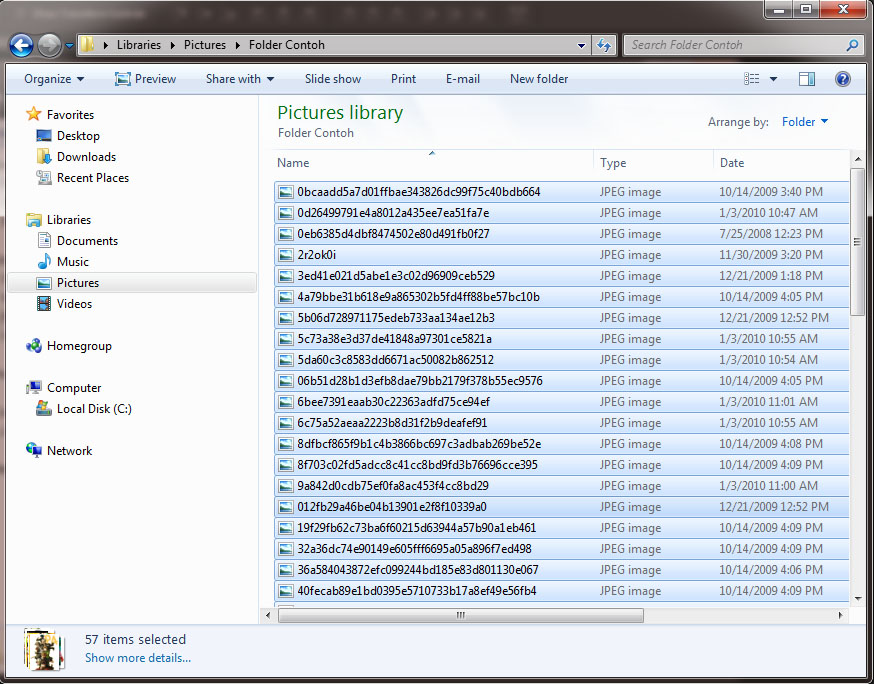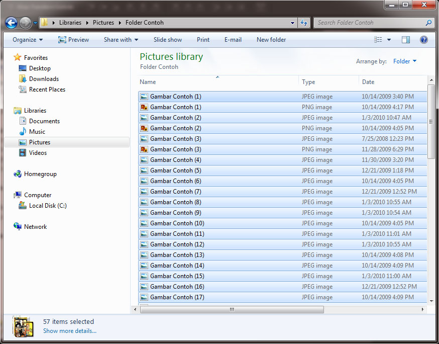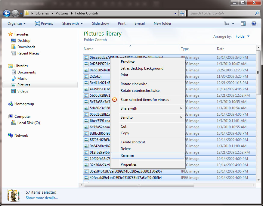 Tiga cara yang terdapat pada sistem operasi Windows sebagai alternatif mengubah nama file dalam jumlah yang banyak ini antara lain dengan menggunakan Windows Explorer, Command Prompt, dan PowerShell. Ketiganya memiliki fungsi yang mirip tetapi memiliki tingkat kesulitan masing-masing. Sehingga Anda bisa mengikuti salah satu dari tiga langkah yang akan kami sajikan sesuai dengan keinginan Anda lebih menyukai langkah yang mana. Sebagai contoh, kami akan memberikan langkah-langkahnya sebagai berikut dengan menggunakan sistem operasi Windows 7. Dan ada baiknya Anda menaruh file yang hendak Anda ubah namanya tersebut di dalam folder tersendiri.