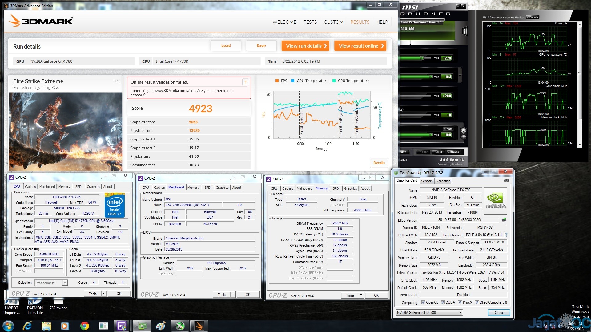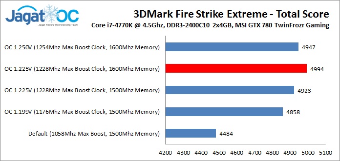Sekarang mari kita melakukan benchmark untuk melihat peningkatan overclockability yang kita dapat dari ekstra voltase. Benchmark yang kita pakai adalah 3DMark Fire Strike Extreme (Nilai default GTX 780 Gaming : 4484).