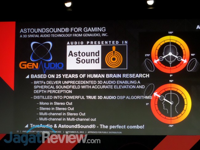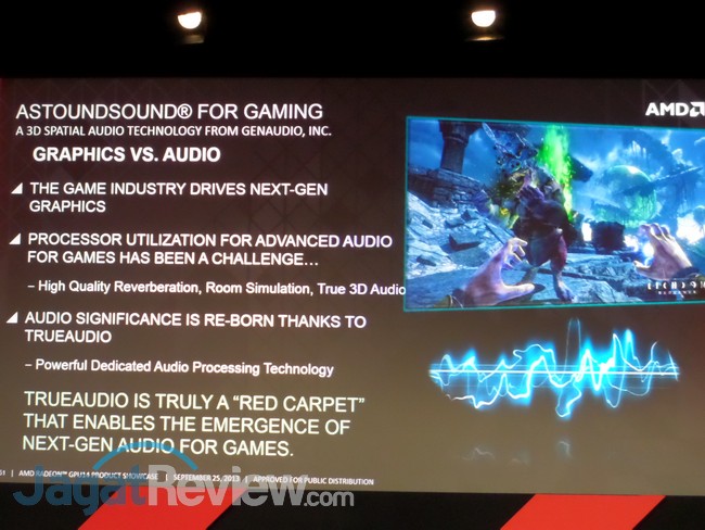03:29 WIB: Koduri memperkenalkan teknologi audio baru: TrueAudio. Koduri sendiri merasa cukup aneh karena dia harus menjadi orang pertama yang memperkenalkan teknologi ini. TrueAudio sendiri adalah sebuah programable audio engine, mirip dengan GPU pada sebuah VGA. Teknologi tersebut memungkinkan adanya ratusan channel audio dalam game yang bisa dinikmati dari posisi output audio apapun.