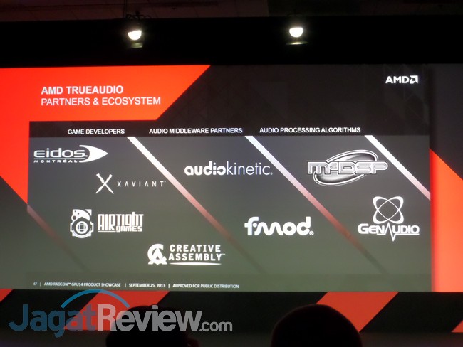 03:30 WIB: TrueAudio mengambil data posisi sumber suara dari engine game, sehingga teknologi tersebut bisa memetakan suara dengan lebih akurat dan bisa menghasilkan suara yang dapat lebih dinikmati oleh gamer. Untuk TrueAudio itu, AMD telah menyiapkan 3 graphics card yang mendukungnya.