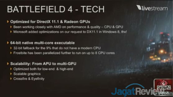 05:25 WIB Johan Andersson, Technical director di Frostbite, menjelaskan seputar perkembangan Battlefield 4, dan juga kelebihan/kekurangan console dan PC. Battlefield 4 juga dijelaskan akan mendukung DirectX 11.1, memiliki native 64-bit .exe, dan juga dukungan CPU hingga 8-core! Yang menarik, BF4 akan dibuat dengan berbagai level detail yang bisa digunakan dari konfigurasi low-end APU hingga konfigurasi high-end dengan multi-GPU.