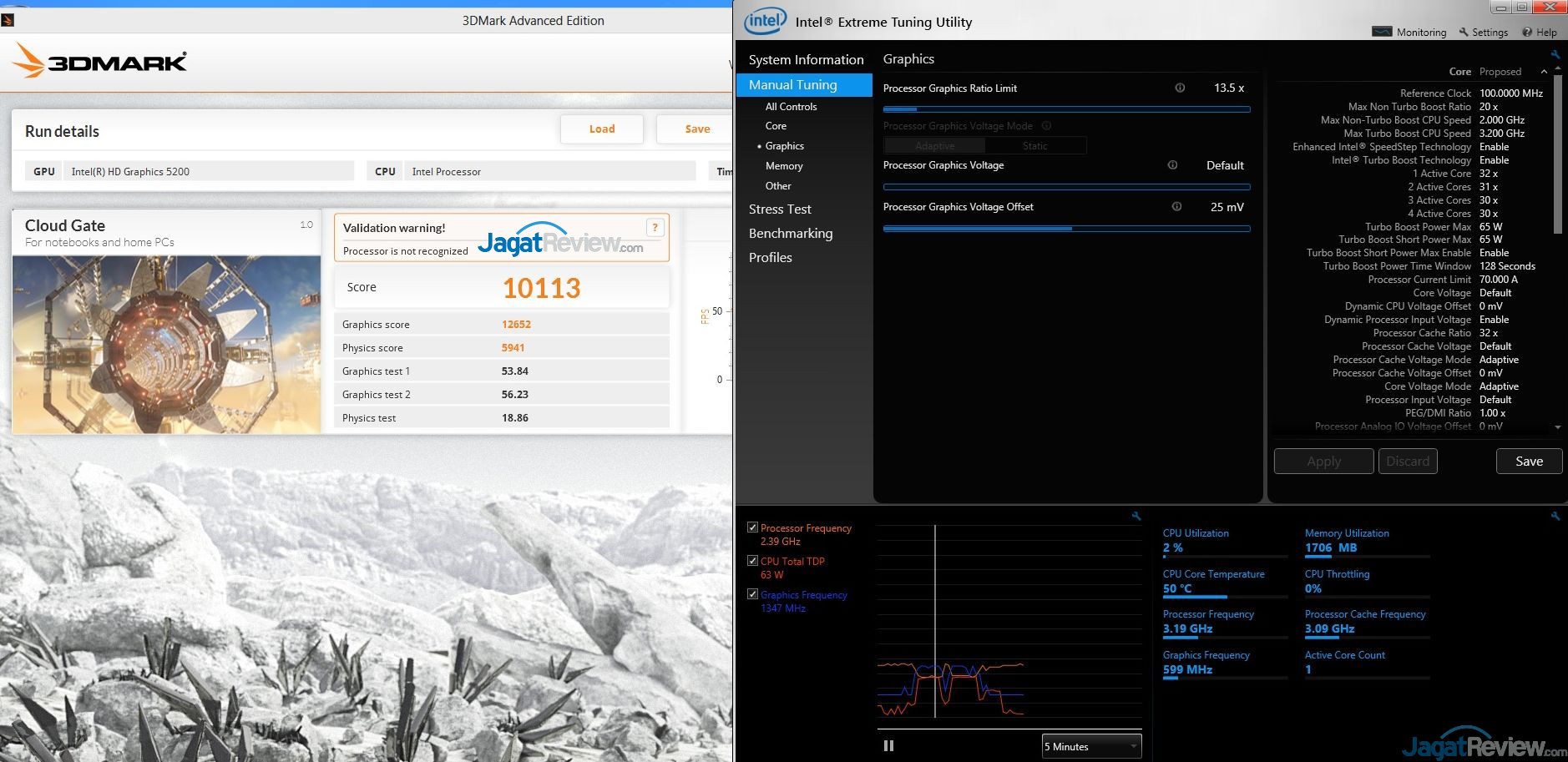 Grafis terintegrasi(IGP) Iris Pro 5200 merupakan salah satu grafis terintegrasi Intel yang terkencang. IGP ini sendiri berjalan pada clock 1.2Ghz. Dengan menggunakan XTU, kami menaikkan nilai Multiplier IGP dari 12x menjadi 13.5x (menghasilkan clock 13.5x100Mhz=1350Mhz), dan memberikan voltase ekstra +25mV.