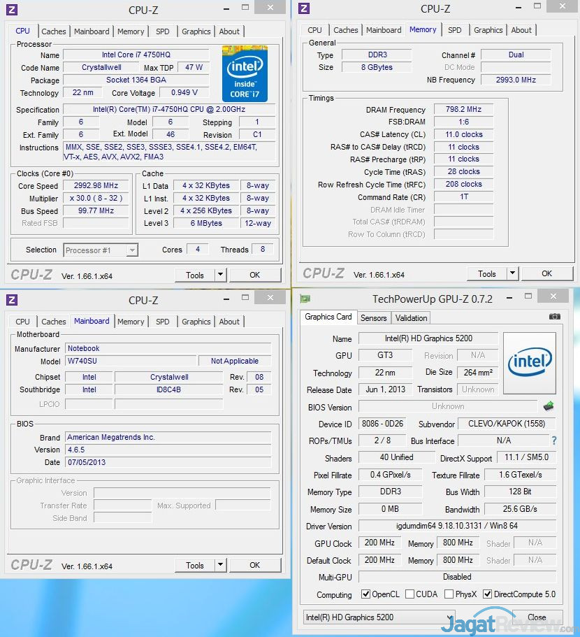 Sampel notebook yang datang ke JagatReview ini bermerk XENOM, dengan model number W740SU terbaca pada CPU-Z. Notebook 14″ yang termasuk tipis di kelasnya ini, dilengkapi dengan sebuah prosesor Intel Core i7-4750HQ, yang didalamnya terdapat sebuah GPU terintegrasi Intel Iris Pro Graphics 5200. Notebook ini juga memiliki RAM sebanyak 2x4GB, berjalan pada DDR3-1600.