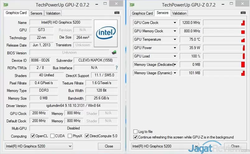 Terlihat diatas, GPU Intel Iris Pro 5200 yang disematkan kedalam CPU Core i7-4750HQ ini, memiliki clockspeed kurang lebih 1200Mhz, dan memiliki 40 buah EU(Execution Unit). Dibanding dengan Intel HD Graphics 4600 yang pernah kami review sebelumnya, Intel Iris Pro 5200 memiliki jumlah EU 2(dua) kalinya! Tidak lupa juga, Intel Iris Pro 5200 dilengkapi dengan sebuah eDRAM(embedded DRAM) cache sebesar 128MB untuk memastikan bahwa GPU Iris Pro 5200 yang ada tidak mengalami bottleneck bandwidth.