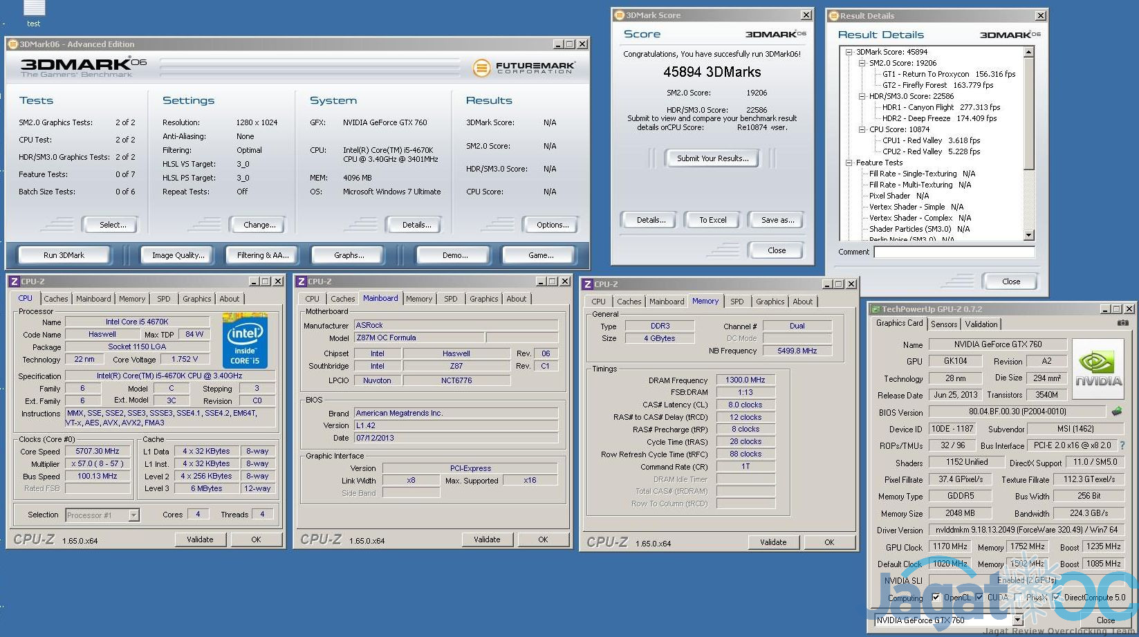 Profil yang kami load adalah ‘LN2 5.8G‘ dan DRAM Preset ‘PSC 2600 Tight 1.92V‘. Pada benchmark 3DMark06, CPU kami berjalan pada clock 5.7Ghz, dan RAM berjalan pada DDR3-2600 CL 8-12-8-28 (sesuai preset). Hasilnya adalah nilai 3DMark06 sebesar 45984.