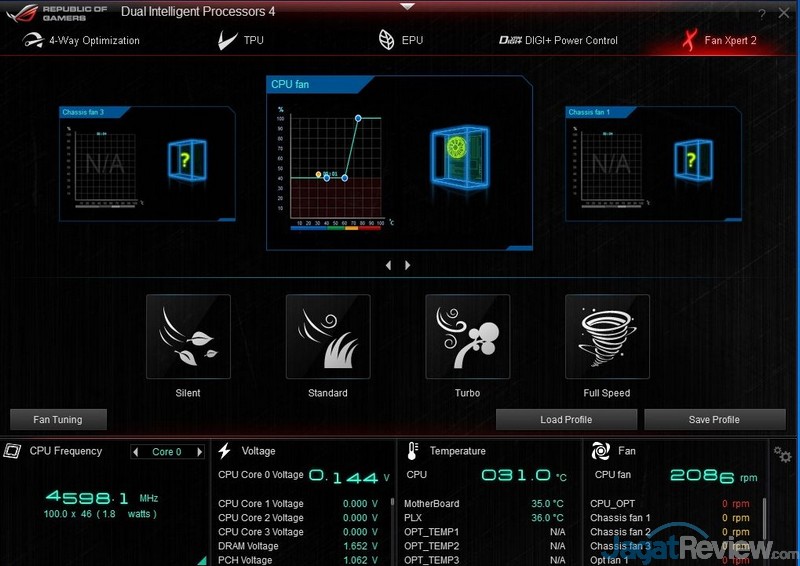 ASUS Ai SUite III menawarkan berbagai pengaturan untuk mengoptimalkan PC sesuai kebutuhan pengguna. Misal, pengguna bisa memilih menggunakan PC dengan keadaan dominan pada power saving, ataupun memilih untuk berjalan di performa tinggi. Pengaturan berbagai konektor fan yang ada di motherboard pun bisa dilakukan disini. Ai Suite terdiri atas 4 modul besar, yakni TPU, EPU, Digi+ Power Control, dan FanXpert.