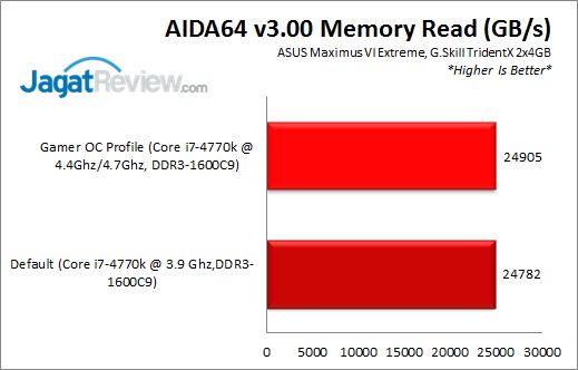 Dibandingkan dengan beberapa sistem lain pada umumnya, ASUS Maximus VI Extreme memiliki sedikit performance advantage, karena BCLK mereka diletakkan pada nilai 100.5 Mhz, bukan 100Mhz pas. Selain itu juga, Pada keadaan defaultnya, ASUS Maximus VI Extreme akan men-set supaya CPU Turbo Ratio untuk 4 Core akan mengikuti nilai Turbo Ratio untuk 1 Core, sehingga CPU akan mengalami kinerja yang lebih tinggi. Yang terakhir, ASUS secara otomatis memberikan nilai DDR3-1600C9-9-9 pada sistem kami, padahal kami tidak menyentuh setting memori sedikit pun, dan ini diterapkan secara otomatis.