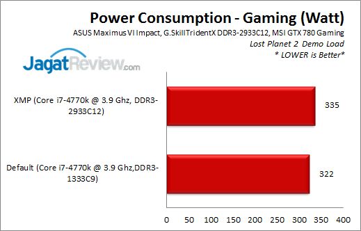 Saat menjalankan aplikasi gaming, sistem mITX yang kami buat memakan daya hingga 335W saat XMP aktif. Cukup normal mengingat kami menggunakan kartu grafis high-end.