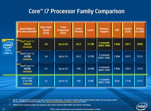 Lini prosesor Core i7 Extreme desktop dengan arsitektur Ivy Bridge E terdiri dari tiga model yaitu Core i7 4960X, Core i7 4930K, dan Core i7 4820K. Core i7 4960X merupakan model paling kencang dan dijual pada kisaran harga $999 (MSRP online). Sementara itu satu tingkat di bawahnya adalah Core i7 4930K dengan kisaran harga jual $555 (MSRP online). Sedangkan model paling murah yaitu Core i7 4820K dijual pada kisaran harga $310 (MSRP online) atau lebih murah dari Core i7 4770K dengan kisaran harga jual $317 (MSRP online).
