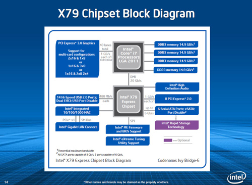 Prosesor Core i7 Extreme Ivy Bridge E tetap menggunakan soket LGA2011 dengan motherboard chipset Intel X79. Pengguna platform Sandy Bridge E dapat melakukan migrasi ke prosesor Ivy Bridge cukup dengan meng-update BIOS motherboard ke versi terbaru. Ivy Bridge E tetap menyediakan 40 buah jalur PCI Express 3.0 untuk mengakomodir konfigurasi multi-GPU hingga empat buah graphics card. Jalur PCIe sebanyak itu juga dapat dimanfaatkan untuk mengakomodir perangkat lain dengan interface PCIe seperti SSD PCIe, sound card PCIe, dan lainnya.