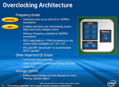 Intel juga menyuntikkan kemampuan overclocking lebih baik pada Ivy Bridge E dibandingkan Sandy Bridge E. Salah satu di antaranya adalah peningkatan nilai multiplier maksimal prosesor dari 57 menjadi 63. Ivy Bridge E juga mewariskan feature BCLK gear ratio atau BCLK multiplier milik Sandy Bridge E dengan besaran multiplier 1.00, 1.25, dan 1.66. Pengaturan setting overclocking kini lebih mudah dilakukan cukup melalui sistem operasi dengan menggunakan aplikasi Intel Extreme Tuning Utility (XTU).