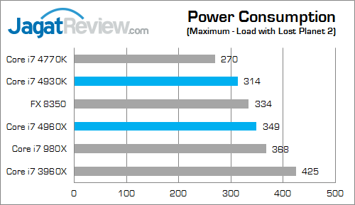 Walaupun performa Core i7 4960X dan Core i7 3960X tidak terpaut terlalu jauh, prosesor Ivy Bridge E tersebut ternyata memiliki konsumsi daya 22% lebih rendah saat seluruh thread dibebani oleh aplikasi LinX. Rendahnya konsumsi daya Ivy Bridge E juga terlihat saat sistem menjalankan game Lost Planet 2 yang membebani sistem secara menyeluruh. Pada kondisi idle, Ivy Bridge E juga mengonsumsi daya lebih rendah walaupun hanya terpaut 2 Watt saja di bawah Core i7 3960X.