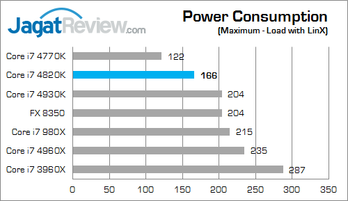 Core i7 4820K ternyata memiliki konsumsi daya lebih tinggi dibandingkan prosesor Ivy Bridge E lainnya tetapi lebih rendah pada kondisi full load.