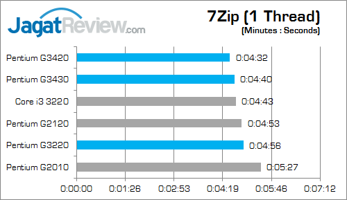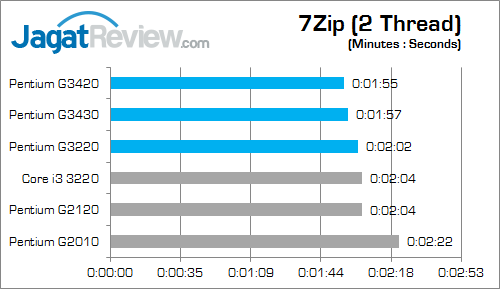 Arsitektur Haswell kembali menunjukkan keunggulannya pada pengujian kompresi file ini. Dengan jumlah penggunaan thread sama, dua Pentium G3000 teratas mampu mengungguli Core i3 3220. Bahkan pada pengujian dengan dua thread, Pentium G3220 juga lebih unggul di atas Core i3 3220. Akan tetapi untuk penggunaan di atas dua thread, tentu saja Core i3 3220 menjadi pemenangnya.