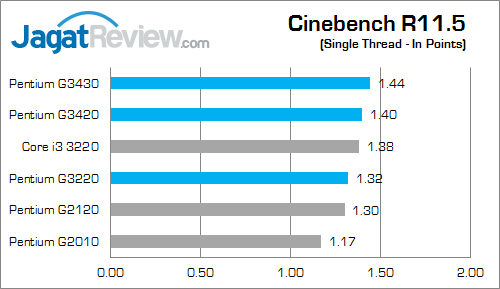 Arsitektur Haswell ternyata menawarkan performa single-core lebih baik dibandingkan Ivy Bridge. Terlihat Pentium G3430 dan G3420 mampu menawarkan performa lebih tinggi dibandingkan Core i3 3220. Sementara itu, Pentium G3000 termurah hadir dengan performa sekitar 9% dibelakang Pentium G3430 tetapi tetap lebih unggul dibandingkan Pentium G2120 yang memiliki clock speed lebih tinggi.