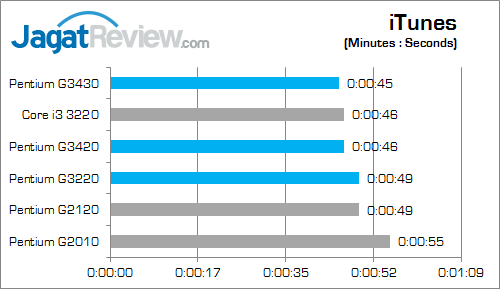 Jumlah thread kembali membuat Core i3 3220 menduduki posisi pertama dengan selisih performa sekitar 10% dibandingkan Pentium G3430. Sementara itu,Pentium G3000 terkencang tersebut terlihat unggul sekitar 3% di atas Pentium G3420 dan sekitar 5% di atas Pentium G3220. Sedangkan Pentium G3000 termurah ternyata menawarkan performa 9% lebih tinggi dibandingkan Pentium G2120 yang memiliki clock speed lebih tinggi.