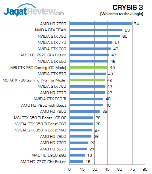 Pada game yang menggunakan Cry Engine terbaru ini, MSI GTX 760 Twin Frozr Gaming OC tidak menunjukkan perbedaan performa pada Gaming Mode, sementara pada OC Mode graphics card ini menunjukkan peningkatan sekitar 7.1%.