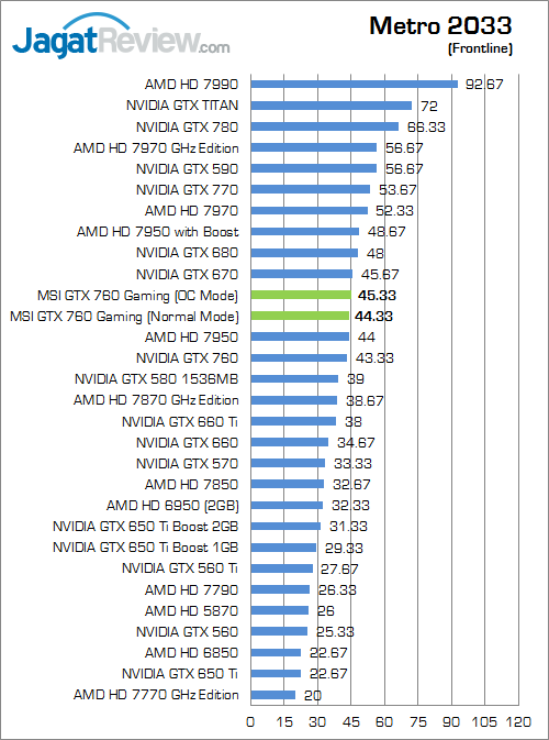 Dalam sekuel terbaru Metro ini, MSI GeForce GTX 760 Twin Frozr Gaming OC tampak setara dengan GTX 760 reference pada Gaming Mode serta naik 6.3% pada OC Mode.