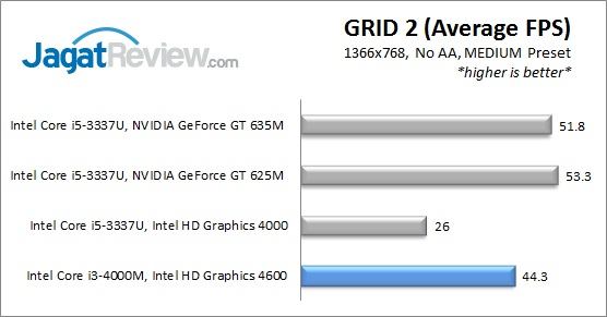 Intel HD Graphics 4600 mencatatkan nilai 44.3 FPS, sebuah peningkatan yang jauh dari Intel HD 4000 yang hanya mendapat 26 FPS, dan selisih sedikit dari NVIDIA GeForce GT 625M / 635M.