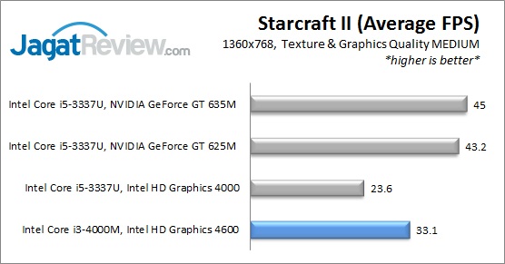 Pada game RTS yang cukup membebani CPU seperti Startcraft II, kombinasi Intel Core i3-4000M dan HD 4600 memberikan hasil yang cukup lumayan, yakni 33.1 FPS, sekitar 10-11 FPS dibawah NVIDIA GeForce GT 625M / 635M, dan 10 FPS diatas Intel HD 4000.