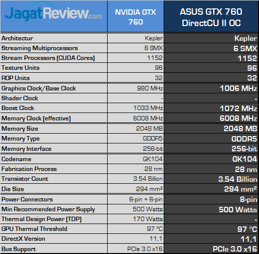 Pada ASUS GTX 760 DirectCU II OC ini, ASUS menaikkan base clocknya sebesar 26 MHz. Sedangkan pada boost clock, ASUS menjanjikan setidaknya graphics card ini mampu berjalan pada kecepatan 1072 MHz, tetapi dalam pengujian yang kami lakukan, ternyata graphics card ini mampu berjalan pada kecepatan 1137 MHz. Pada bagian memory clock, ASUS tetap mempertahankan kecepatan clock sesuai dengan reference NVIDIA.