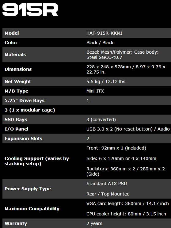 Berikut spesifikasi singkat dari Cooler Master HAF 915 R :
