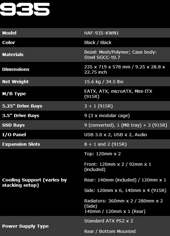 Berikut spesifikasi singkat dari Cooler Master HAF 935 :