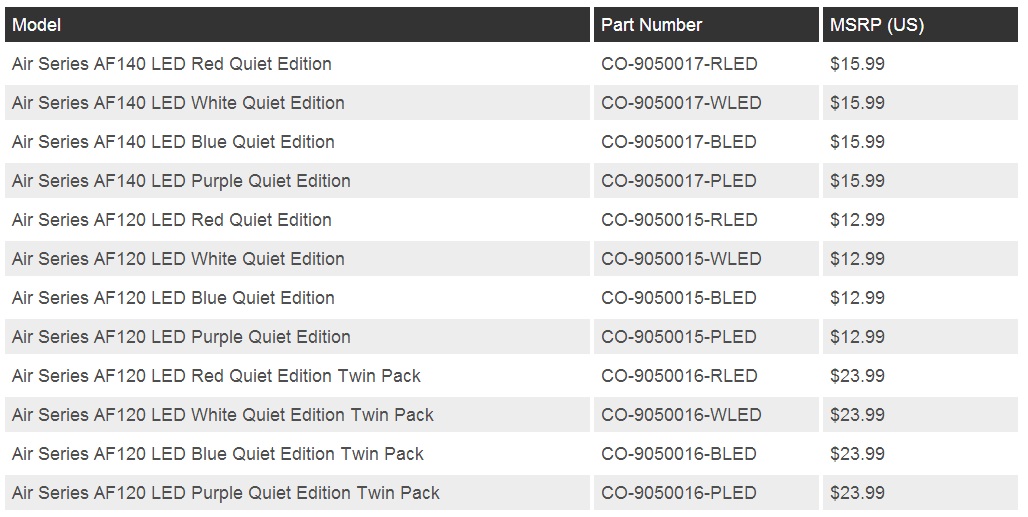Corsair Air Series LED FAN ini akan hadir dengan 2 model ukuran, yakni 120 mm dan 140 mm. Selain memiliki 2 varian ukuran, kipas pendingin ini juga memiliki 4 varian warna, yakni: merah, biru, putih dan ungu.