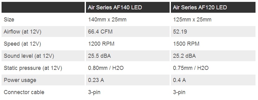 Berikut spesifikasi dari kipas pendingin Corsair Air Series LED FAN untuk ukuran 120 mm dan 140 mm:
