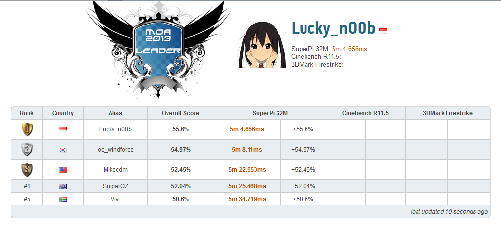 11:30 WIB: Vivi dari Afrika Selatan mengambil alih posisi 2 dari OC_Windforce setelah catatan waktu terbarunya melampaui catatan waktu dari overclocker asal Korea Selatan tersebut. Sejauh ini, 13 overclocker telah mencatatkan waktu di sesi ini.
