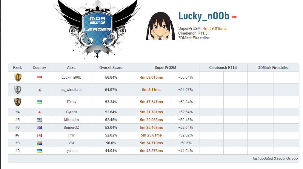 12:00 WIB: Hingga 20 menit awal sesi kedua ini, baru 5 overclockerm yaitu T0lsty, zzolio, SniperOZ, JJJC, dan Mikecdm yang mencatatkan skot mereka di benchmark Cinebench R11.5.