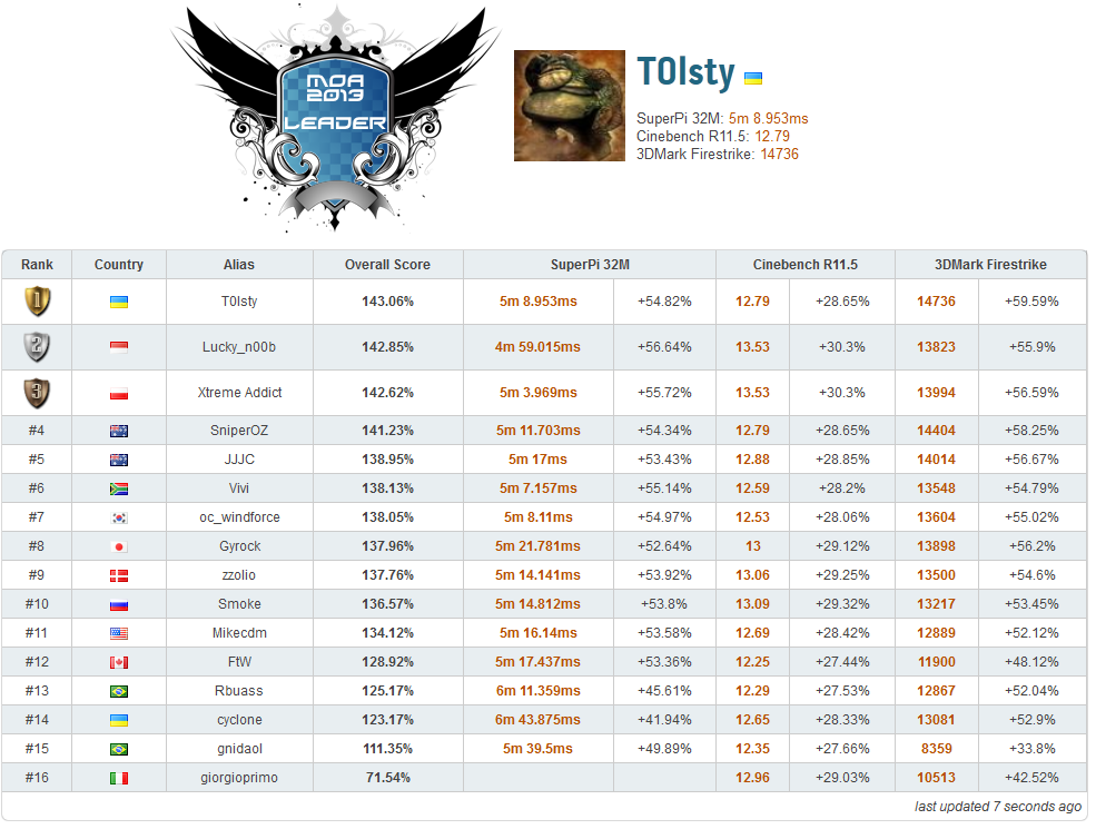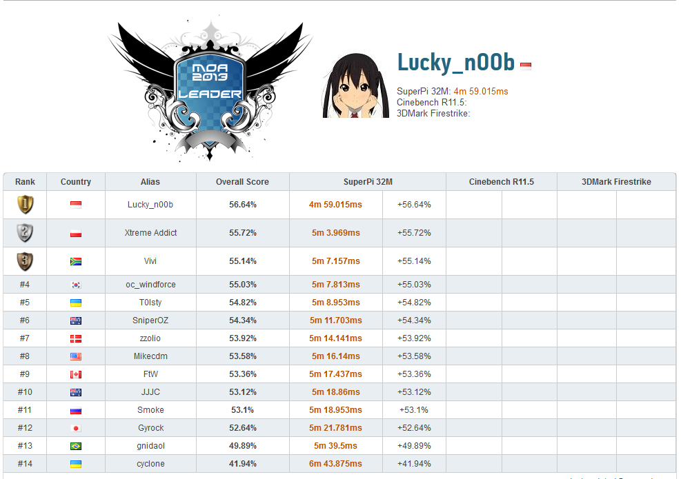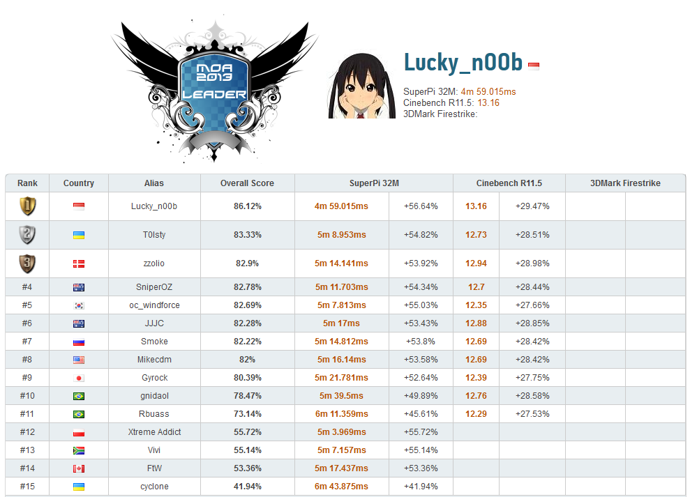 Inilah hasil MOA 2013 setelah semua overclocker menyelesaikan 3 sesi benchmark yang ada: