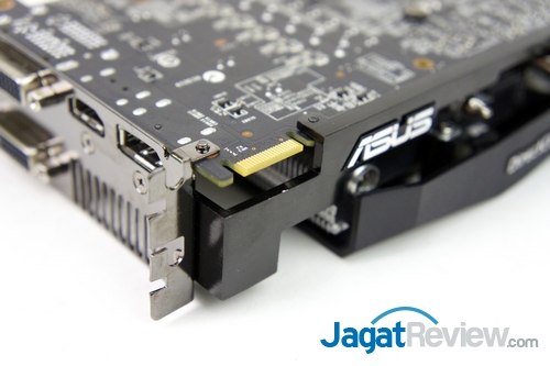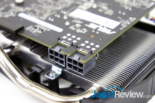 Pada sektor daya, untuk memastikan graphics card ini tidak kekurangan daya selama bekerja, ASUS menyiapkan 2 buah konektor daya PCIe 6-pin. ASUS juga melengkapi setiap konektor daya PCIe dengan 2 buah lampu LED yang akan memberikan petunjuk pada pengguna. Petunjuk warna merah jika konektor daya PCIe belum terpasang dengan baik dan warna hijau jika sudah terpasang dan berfungsi dengan baik.