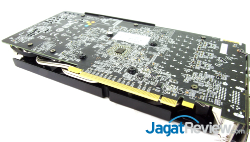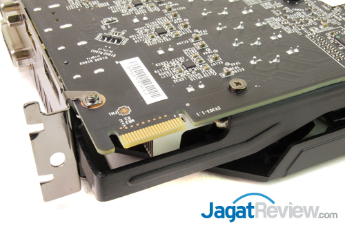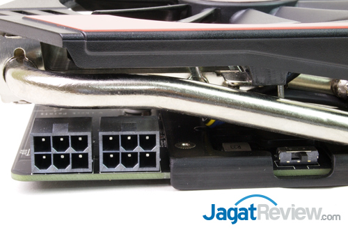 MSI R9 270X Twin Frozr Gaming dilengkapi konektor daya PCIe 6-pin + 6-pin seperti halnya Radeon R9 270X reference. Konfigurasi seperti ini memungkinkan graphics card mampu mendapatkan asupan daya hingga sebesar 225 Watt. Tidak jauh dari konektor daya PCIe dapat dijumpai switch Dual BIOS.