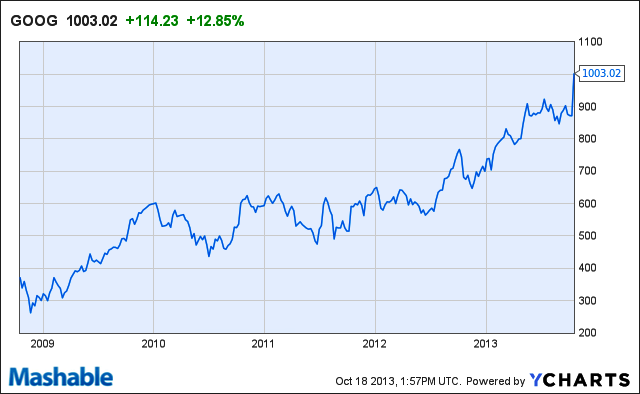 Saham raksasa internet Google berhasil melonjak US$ 122,61 atau 14 persen menjadi US$ 1.011,41 per lembar pada penutupan perdagangan Jumat pekan lalu di bursa Amerika Serikat. Ini pertama kalinya dalam sejarah Google berdiri harga sahamnya menembus angka US$ 1.000.