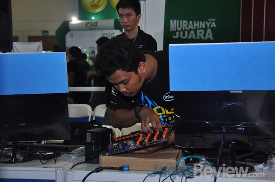 Selanjutnya, peserta harus memindahkan sistem yang digunakannya ke basis motherboard dari Gigabyte, GA-Z87X-OC untuk sesi kedua Pro OC Tournament ini. Beberapa peserta tampak masih belum terbiasa dengan benchmark yang memang baru beberapa waktu lalu mulai digunakan untuk turnamen overclocking ini. Walaupun begitu, berkat pengalaman mereka di berbagai ajang turnamen overclocking, para overclocker profesional ini mampu menemukan konfigurasi terbaik untuk menjalankan benchmark ini.