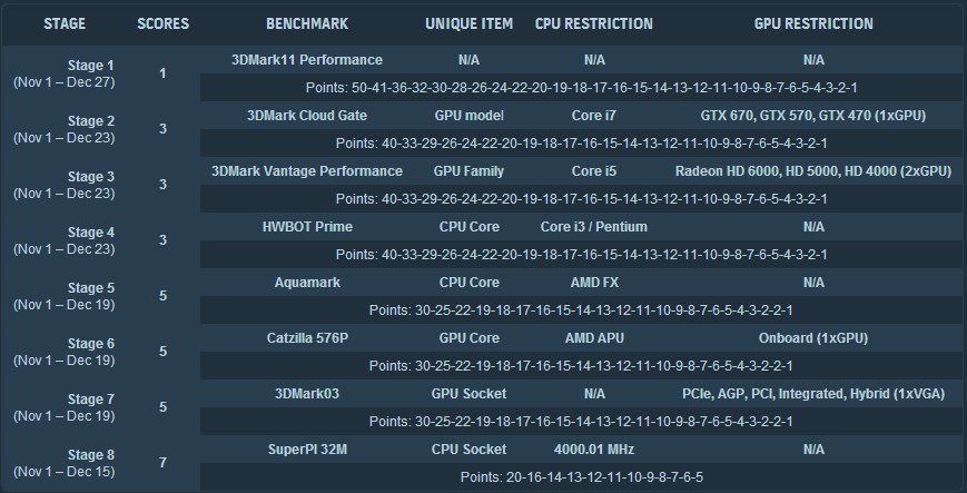 - Stage 8: Benchmark yang digunakan adalah SuperPi 32M. Tidak ada persyaratan hardware(cpu dan gpu bebas). Dari tiap negara akan diambil rata-rata dari tujuh skor tertinggi yang menggunakan tujuh konfigurasi hardware berbeda berdasarkan jenis soket CPU.