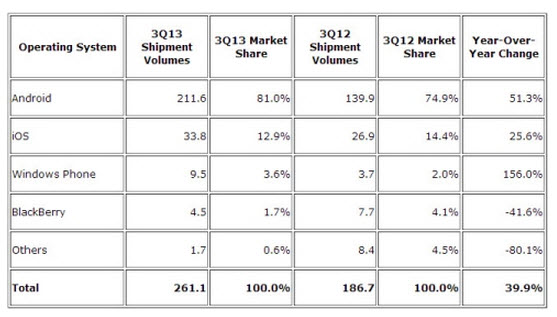 “Juga mencapai tonggak sejarah adalah Microsoft Windows Phone yang tumbuh menakjubkan sebesar 156 persen dari tahun lalu. Memang, volume penjualan dimulai dari basis yang kecil sebesar 3,7 juta unit tahun lalu dan pangsa pasar keseluruhan masih kurang dari dari lima persen. Tetapi, upaya Microsoft dan dukungan Nokia di balik itu telah membantu mendorong platform ke beberapa tingkatan dan poin harga,” kata IDC dalam siaran persnya.
