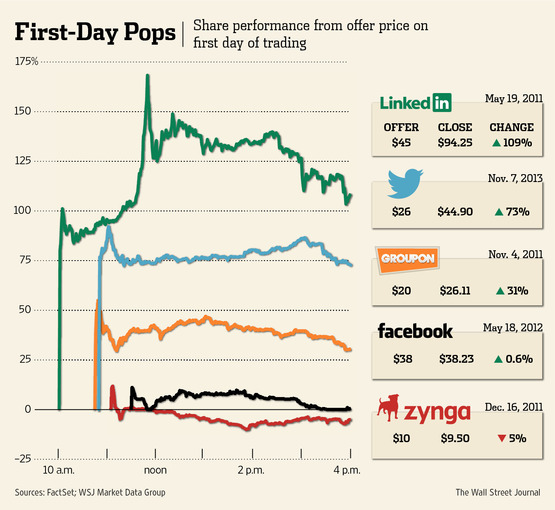 Sebagai perbandingan dengan pesaing terdekatnya, Facebook sewaktu IPO, jejaring sosial tersebut menetapkan harga saham begitu tinggi hingga US$ 38 per lembar saham. Pihaknya berharap dapat mendapatkan pendanaan dalam penawaran tersebut hingga US$ 16 miliar. Memasuki September di tahun sama, saham mereka di bursa malah jatuh ke level terendah US$ 17,55 per lembar. Pihaknya terus mengalami keterpurukan dari pertengahan hingga akhir 2012 silam.