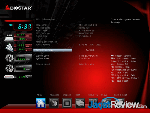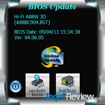 Seperti produsen motherboard lainnya, Biostar juga menggunakan UEFI BIOS untuk motherboard Hi-Fi A88W 3D. BIOS motherboard ini tergolong mudah untuk dinavigasi dan cukup responsif saat berpindah antar menu satu dan lainnya. Tidak hanya menyediakan setting standar motherboard AMD A88X, BIOS motherboard ini juga memiliki menu bernama O.N.E berisi berbagai setting untuk melakukan overclocking. Di sisi kiri menu BIOS dapat dijumpai informasi mengenai kondisi sistem seperti temperatur, putaran kipas, dan voltase.