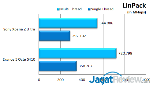 LinPack merupakan benchmark untuk mengukur kinerja sebuah perangkat dalam menghitung floating point. Hasilnya dalam bentuk nilai operasi floating point per detik atau MFLOPS (Million Floating Point Per Second). Semakin tinggi nilainya, semakin baik. Kami cukup terkejut dengan hasil seperti ini.