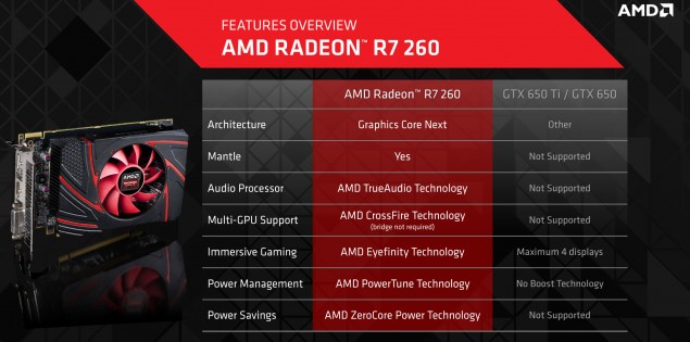 Dengan cukup percaya diri AMD membandingkan langsung R7 260 miliknya dengan GTX 650 Ti, dengan klaim berbagai fitur terbaru seperti GCN yang mendukung API Mantle, dan dukungan fitur AMD TrueAudio Technology yang menandakan bahwa R7 260 ini merupakan “racikan” graphics card AMD yang benar-benar baru, dan bukan sekedar rebrand.