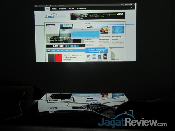 Sedangkan untuk suhu operasi, kami mencoba melakukan pengukuran suhu operasi perangkat dengan meletakkan probe dari digital thermometer di lubang exhaust dari proyektor ini. Kami sengaja membiarkan proyektor beroperasi terlebih dahulu kurang lebih selama 15 menit di suhu ruangan standar untuk mendapatkan temperatur kerja dari proyektor tersebut. Hasilnya, kami mendapatkan catatan suhu operasi perangkat ini berkisar antara 51° C hingga 55° C.