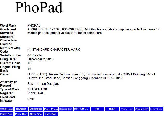 Huawei semakin mantap menapaki pasar piranti mobile. Baru-baru ini perusahaan multinasional asal China tersebut telah mendaftarkan sebuah merek dagang ke United States Patent and Trademark Office atau USPTO. Huawei nampaknya tengah mengerjakan sebuah proyek piranti baru dimana nama yang dimasukkan dalam aplikasi paten dinamakan Huawei PhoPad.