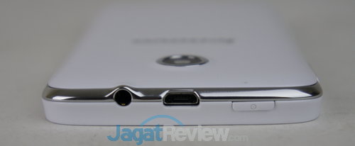 Pada bagian atas smartphone terdapat tombol power, slot USB, dan slot audio jack 3.5 mm.