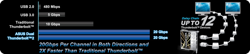 Kedua card ASUS ThunderboltEX II ini menggunakan chipset berbasis Intel DSL5320 dan DSL5520 yang mendukung interface Thunderbolt 2.0 standard, dengan menawarkan kecepatan bandwidth 20Gb/s cukup dengan satu kabel saja.
