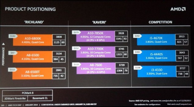 Slide ini cukup menarik karena memaparkan berbagai skor benchmark dari AMD Kaveri, dan juga harga MSRP dari beberapa APU AMD Kaveri. Terlihat diatas bahwa APU A10-7850K bisa mencatatkan skor 3DMark Fire Strike sebesar 1541. Ini termasuk tinggi untuk ukuran kartu grafis terintegrasi. AMD tidak memberikan spesifikasi detail(terutama kecepatan RAM) mengenai sistem yang digunakan, namun sebagai perbandingan, prosesor Intel i5-4670K hanya bisa mencatatakan skor 821-an pada 3DMark Fire Strike.