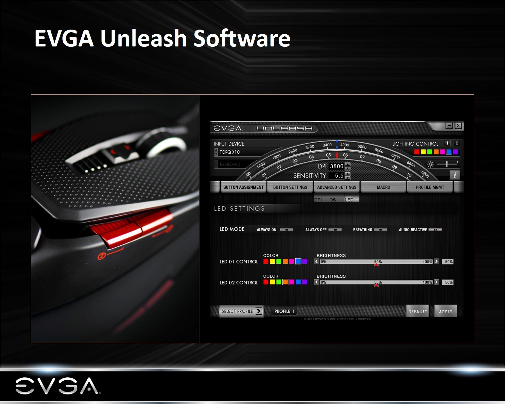 Dari segi software, EVGA juga menggarapnya dengan serius. Terdapat total sembilan buah tombol yang dapat diprogram sesuai kebutuhan menggunakan software ini, dan LED (RGB) yang menghiasi mouse ini dapat di custom secara manual menyesuaikan tema PC Anda. Semua setting profile yg telah dilakukan bisa disimpan kedalam memory terintegrasi, sehingga tidak diperlukan lagi software jika Anda menggunakannya pada PC lain. Belum ada keterangan mengenai harga dan ketersediaan mouse gaming keren dari EVGA ini.
