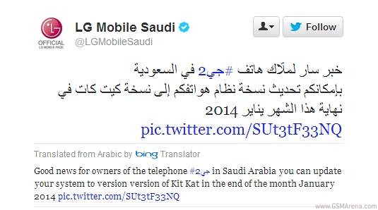 Kabar tentang perilisan OS KitKat 4.4 ini dikatakan langsung oleh admin twitter official LG dari Arab Saudi, yang menyebutkan bahwa pengguna LG G2 di Arab Saudi (yang berarti versi internasional) dapat mulai melakukan update device miliknya mulai akhir Januari ini.