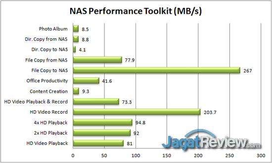Hasil dari pengujian menggunakan NAS PT menunjukkan NAS ini memiliki kemampuan yang baik dalam menangani pengkopian file ke dalam NAS. Terlihat hasil skenario perekaman video serta pengkopian file ke NAS yang mencapai lebih cari 200 MB/s. Namun, hasil untuk pengkopian directory dari dan ke NAS bisa dikatakan agak sedikit kurang. Walaupun begitu, secara umum NAS ini memiliki performa yang baik.